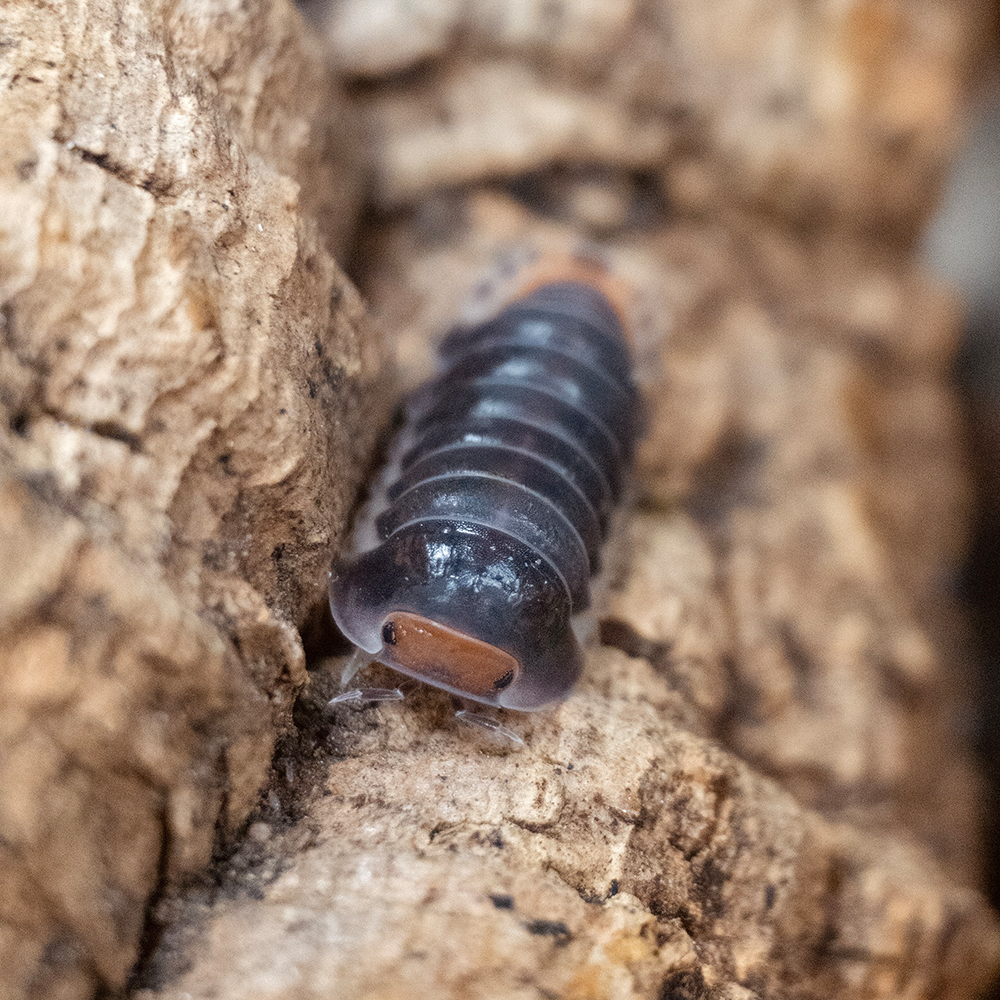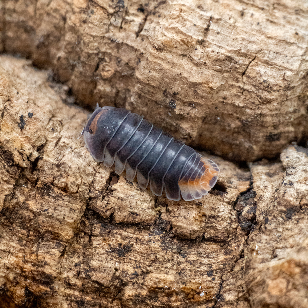 Cubaris spec. „Pak Chong“ – tropische Zierassel fürs Terrarium mit markanter Zeichnung und kompaktem Körperbau. Die Art ist im Hobby vor allem wegen ihres dunklen Grundtons mit hellen Seitenakzenten sowie der oft rötlich bis orange gefärbten Kopf- und Hinterpartie beliebt. Sie eignet sich für feuchte Assel-Setups, Terrarien und strukturierte bioaktive Anlagen.